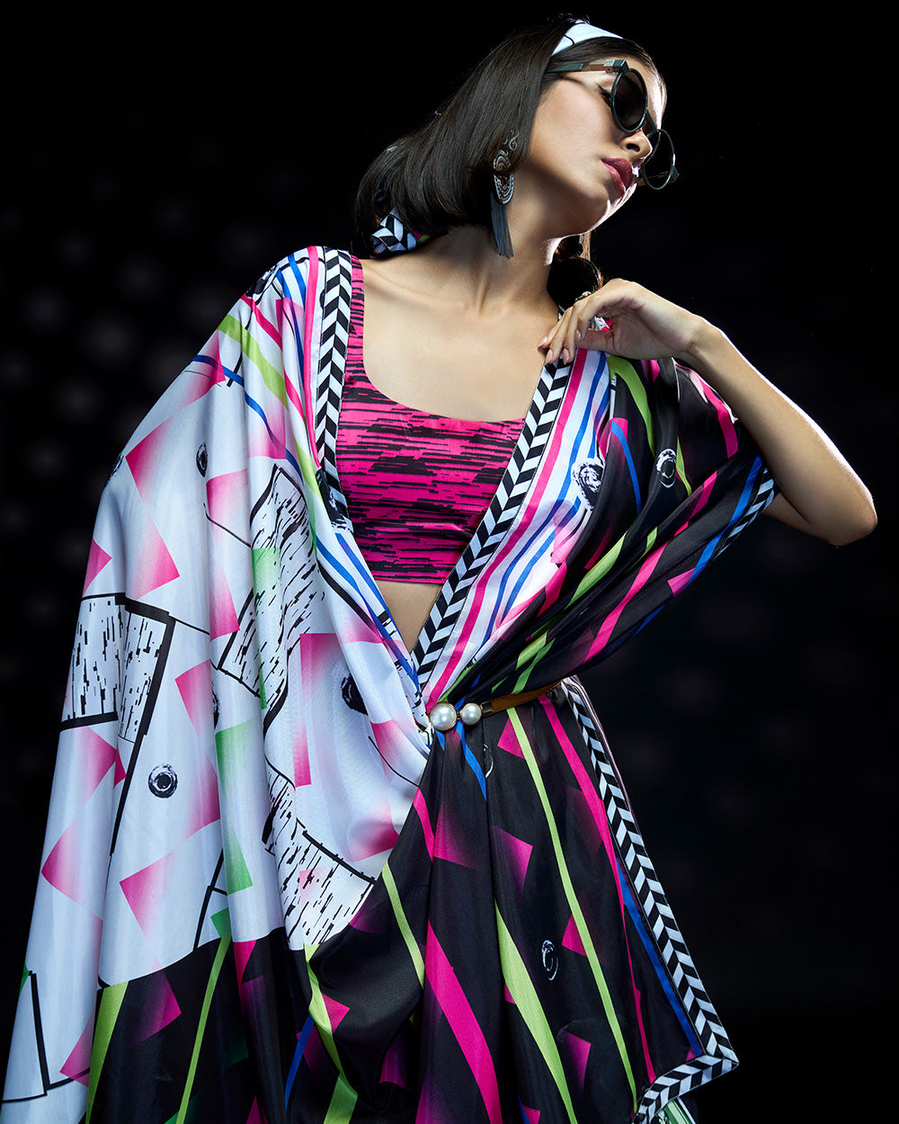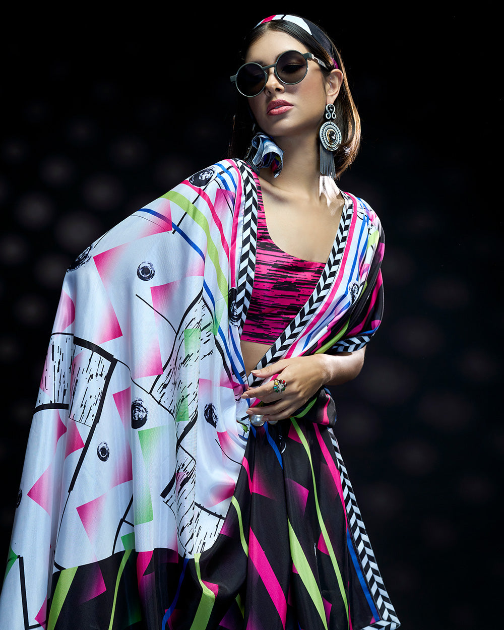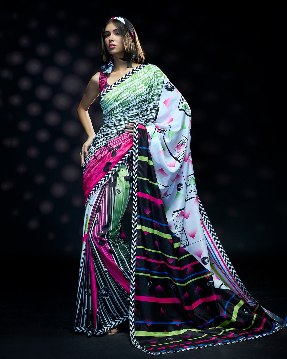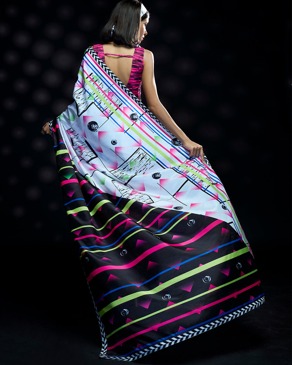 This lightweight Terylene crepe saree bursts with bold pink and white contrasts,