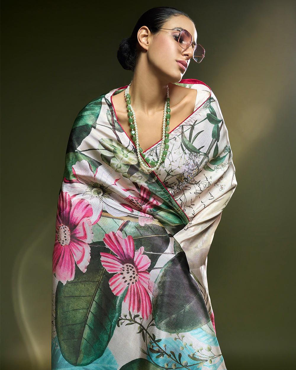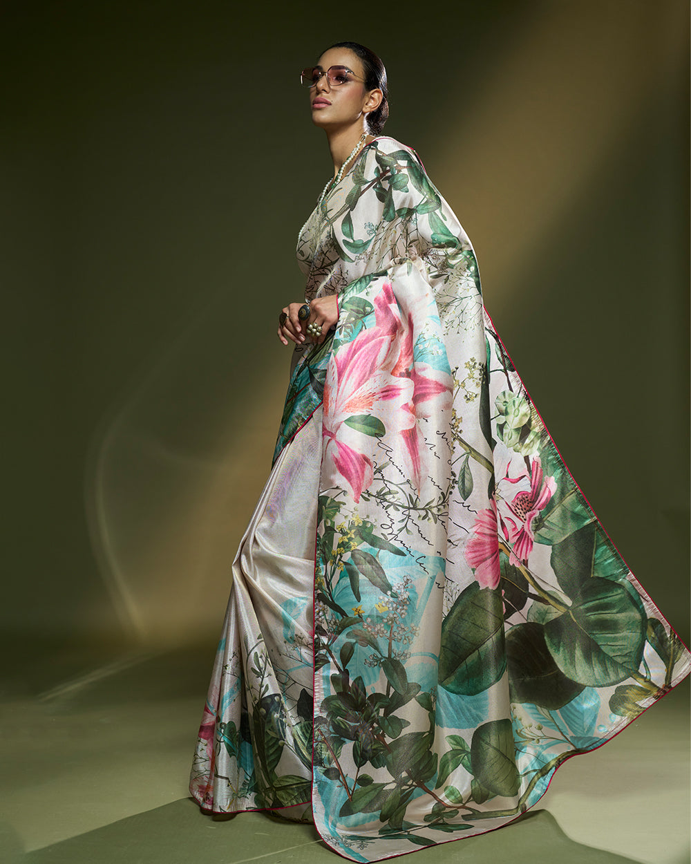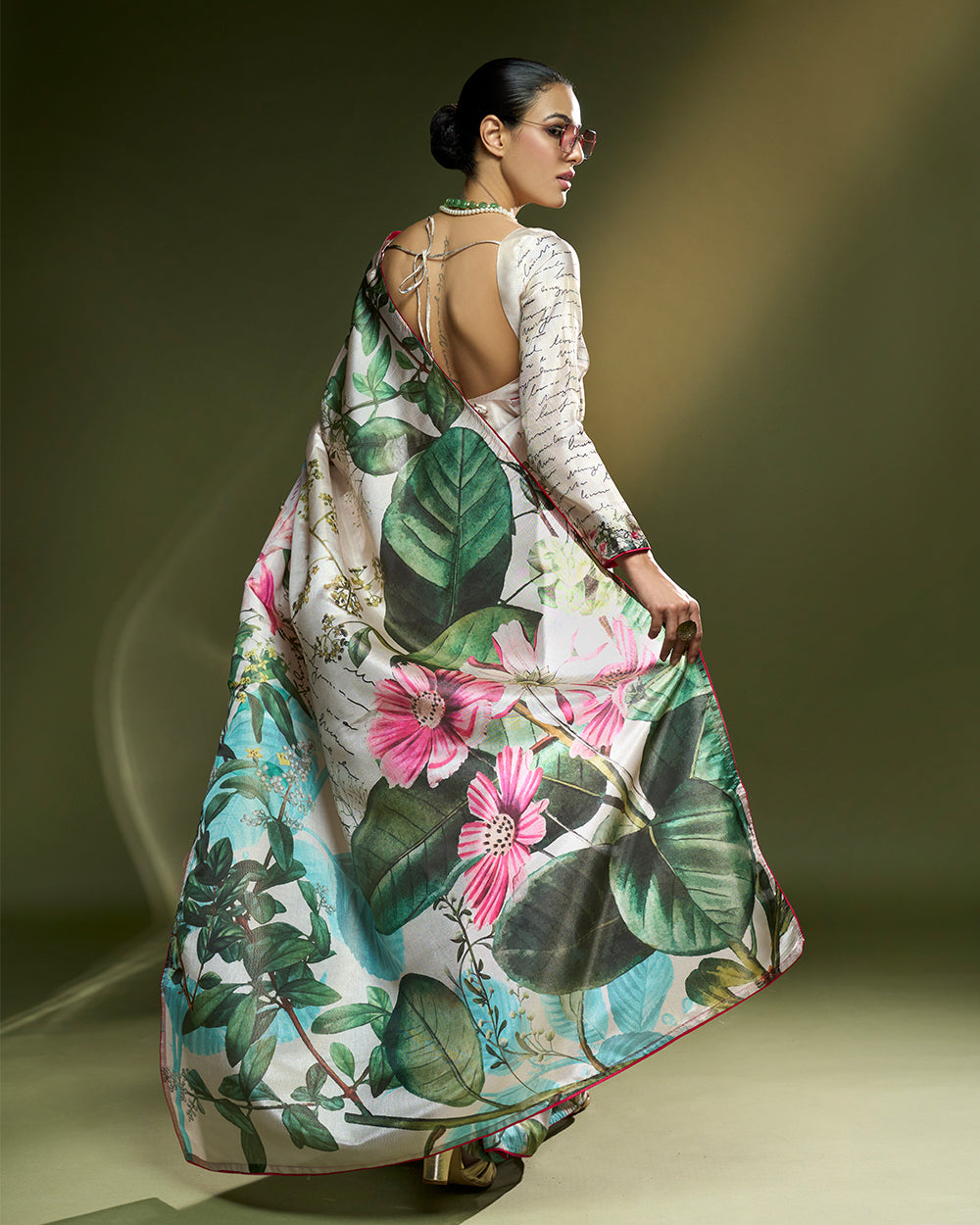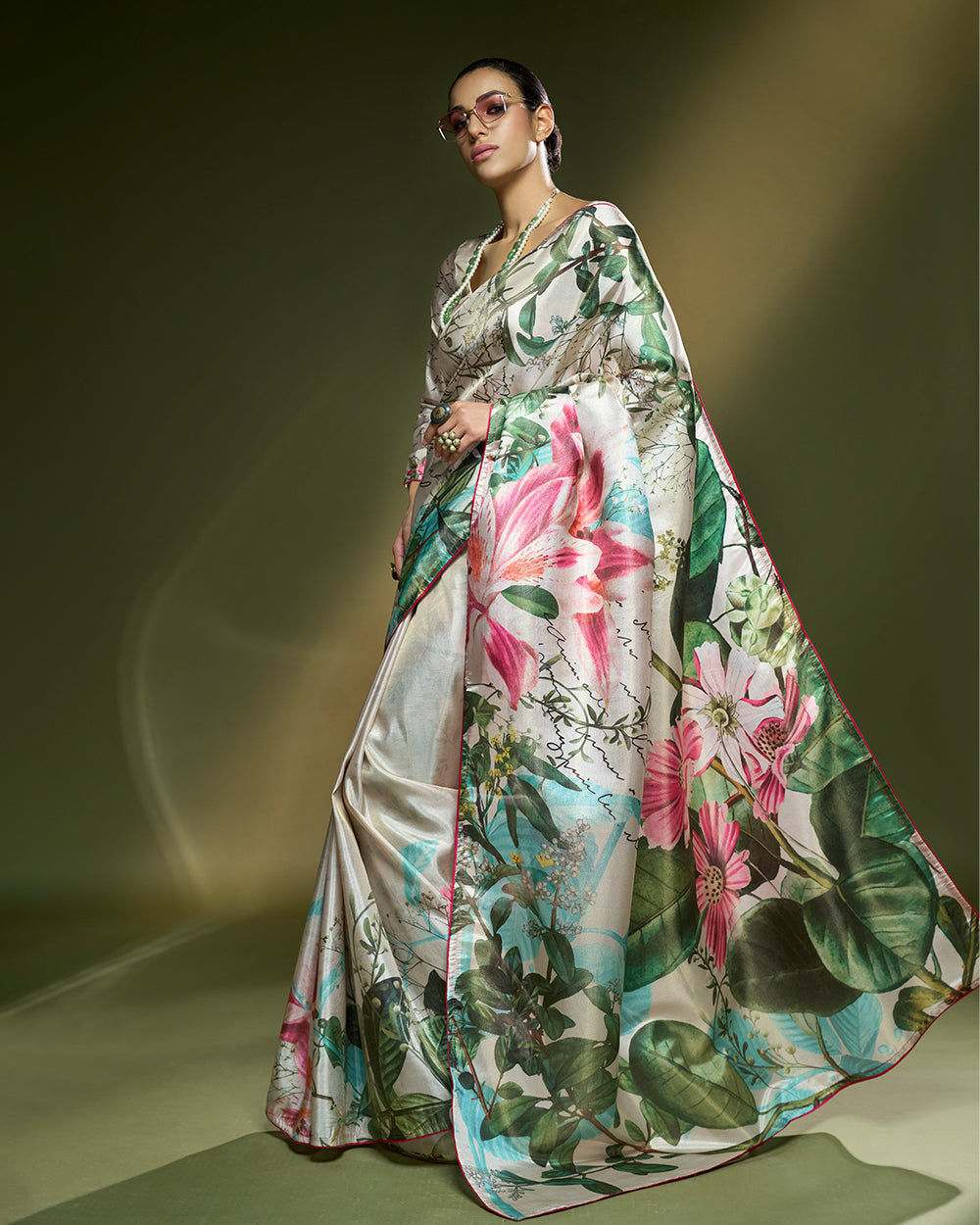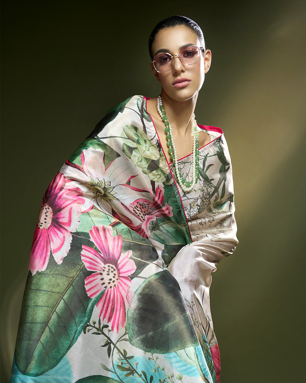 Lightweight tussar tissue forms the base of this ivory saree, adorned with florals,