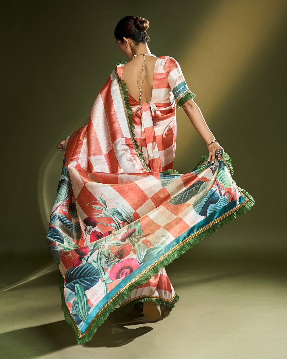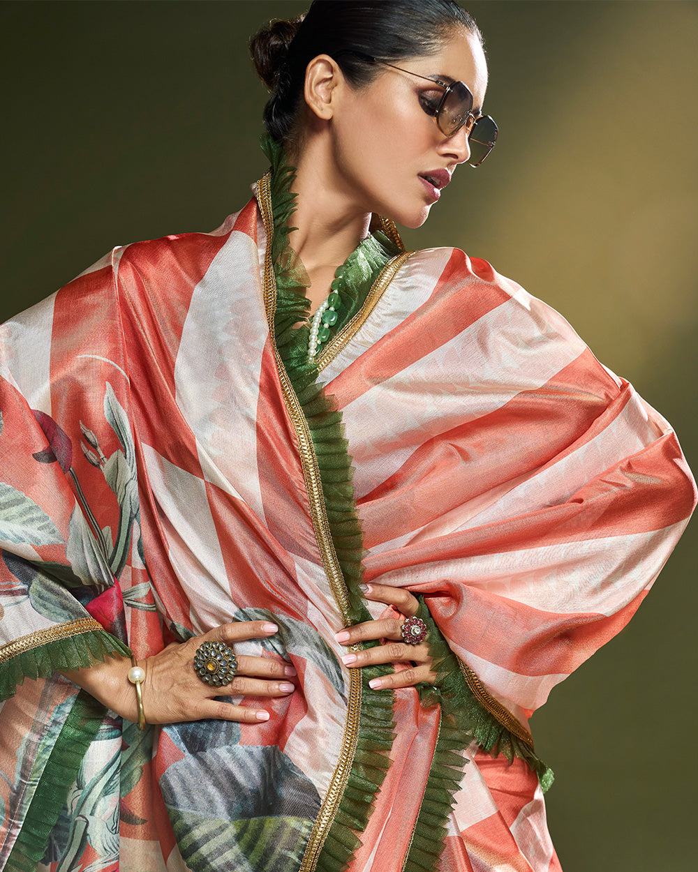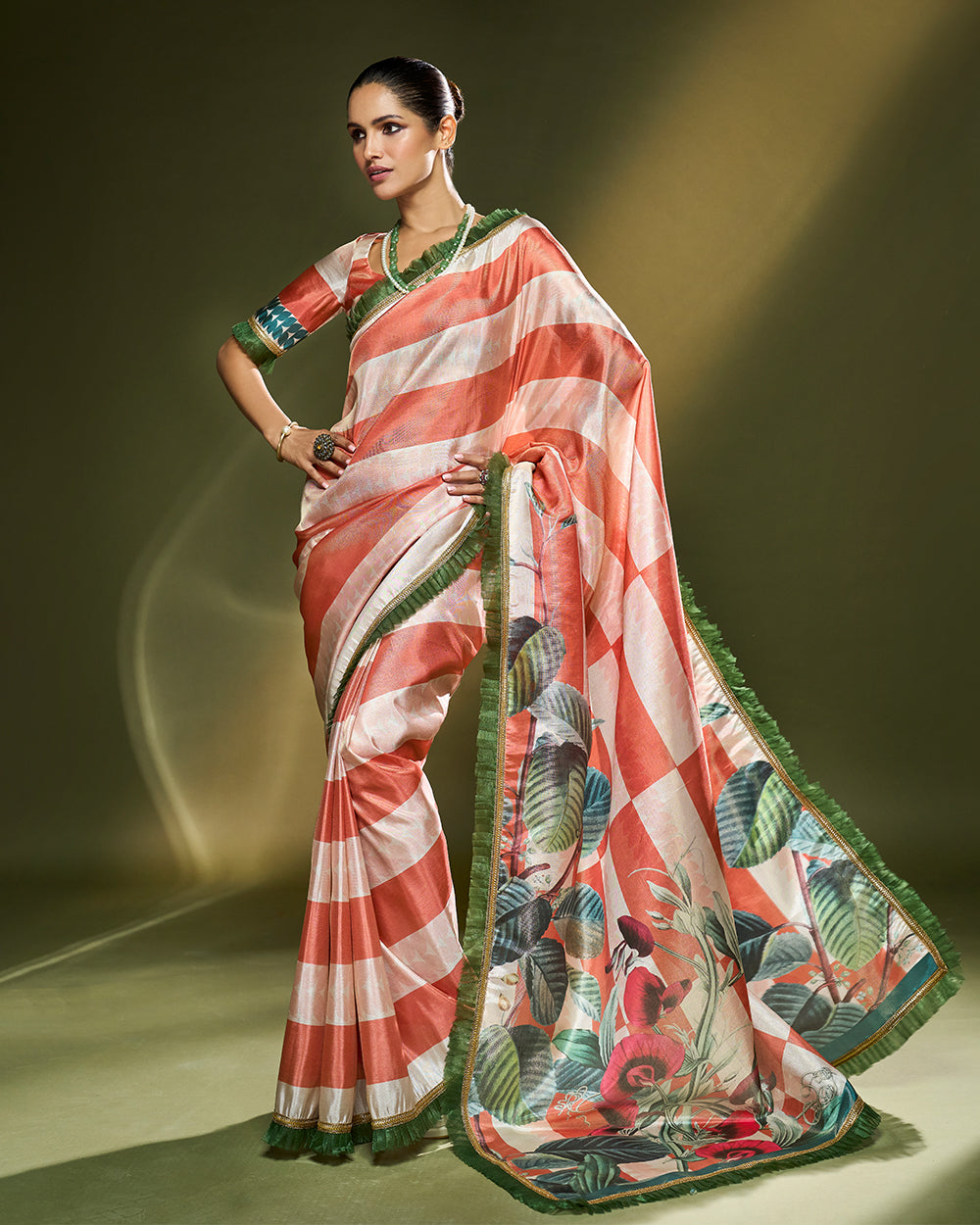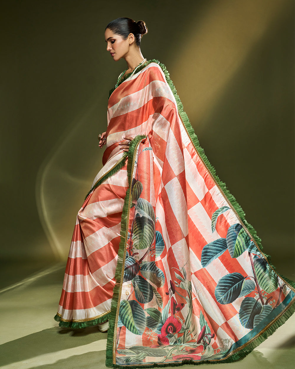 lush green leaf motifs and subtle floral accents. Its fabric falls with fluid