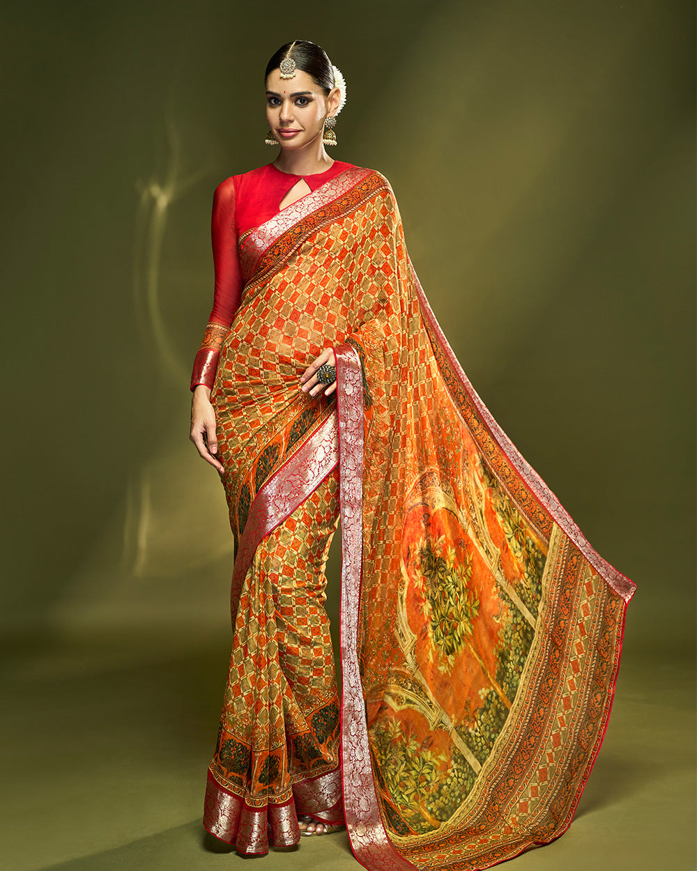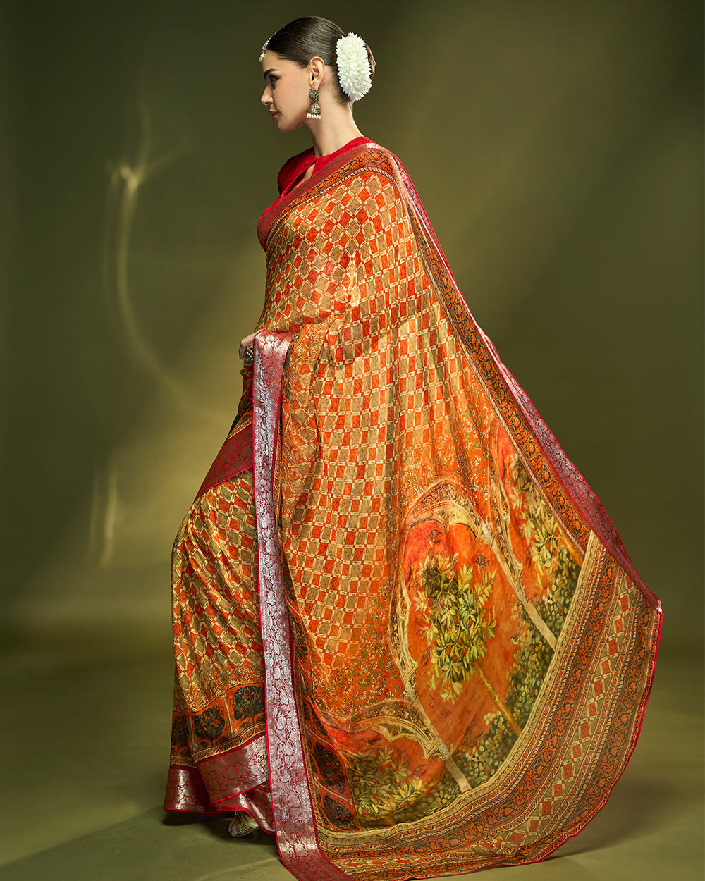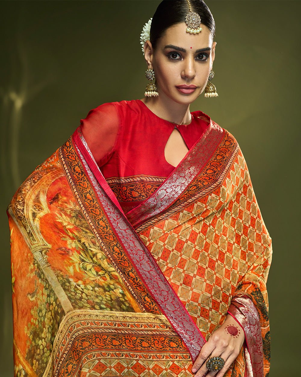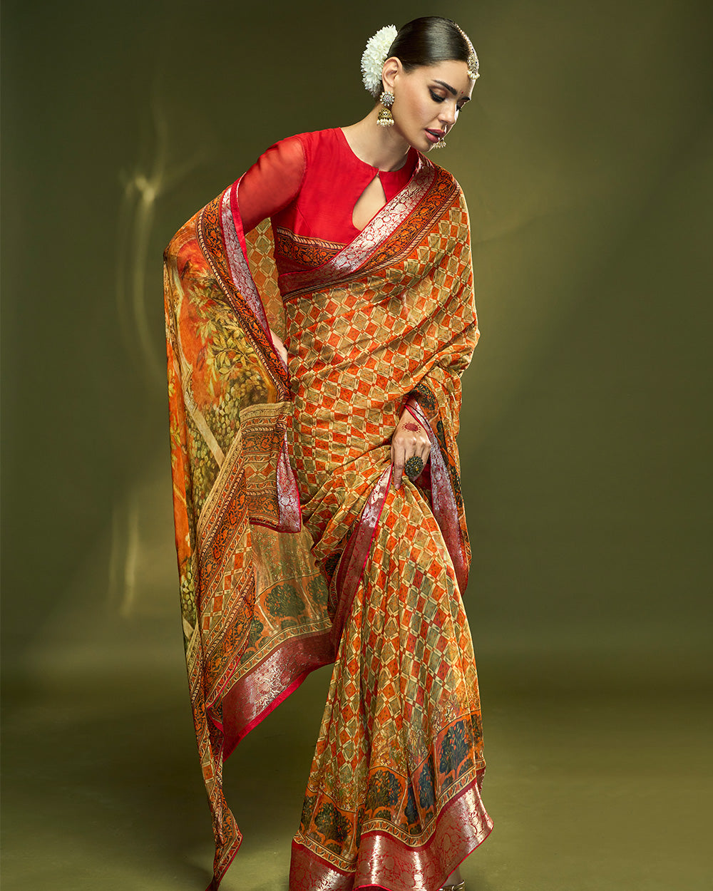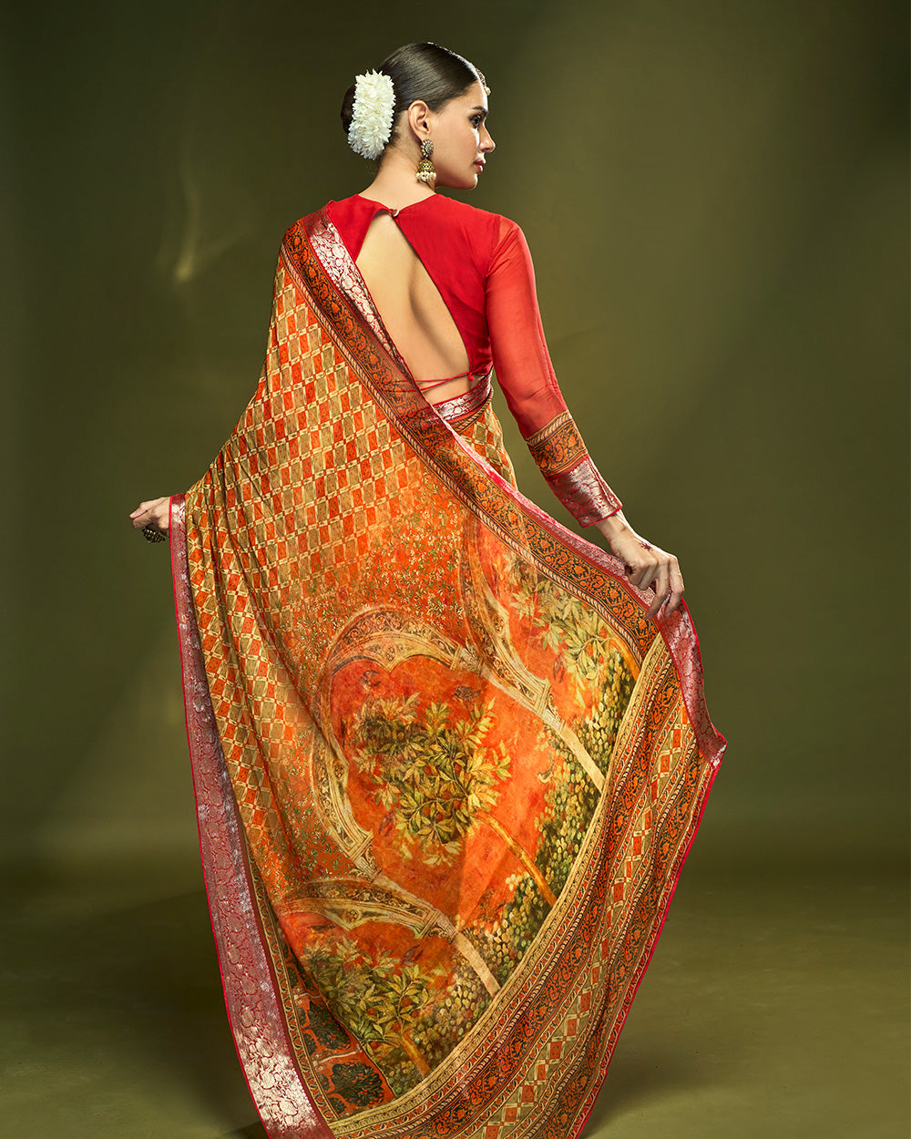 Rich in cultural grace, this pure chiffon silk saree comes alive in earthy red and golden hues. It carries intricate patterns, leading into a moghul floral print with garden motifs framed in arch like timeless beauty.