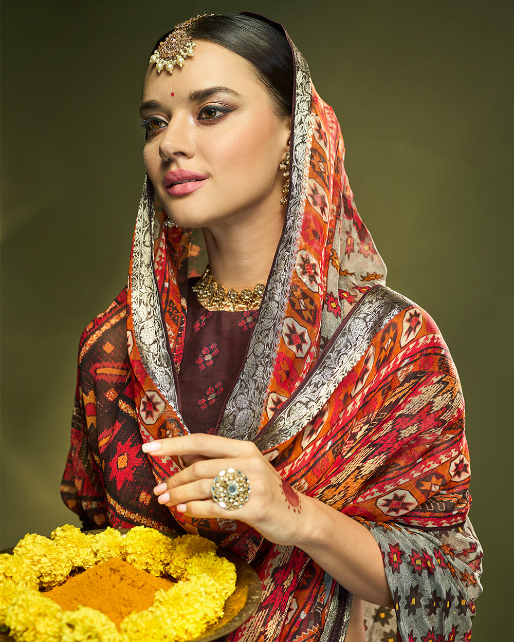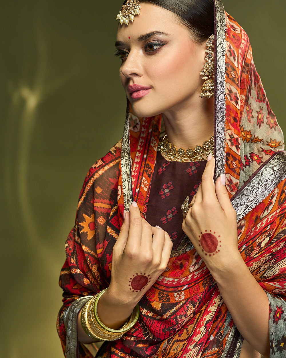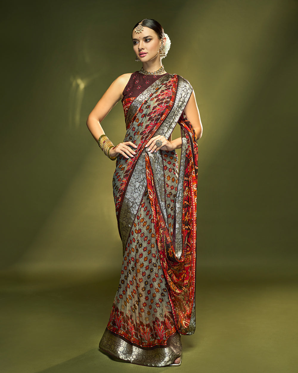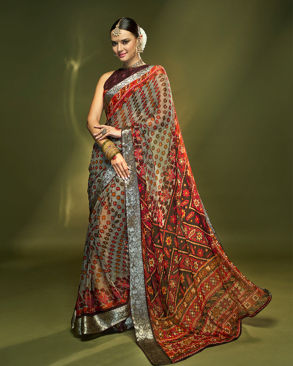 Crafted in pure chiffon silk, this saree in grey and deep maroon is styled with fine patterned repeating all over with detailed pallu of patola prints. The earthy palette and pure silver zari border makes it a graceful choice for cultural occasions.