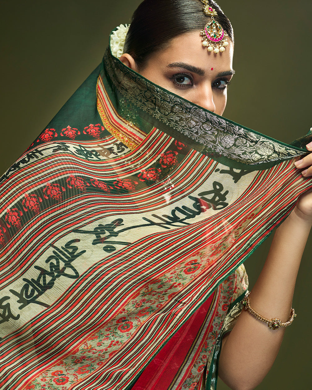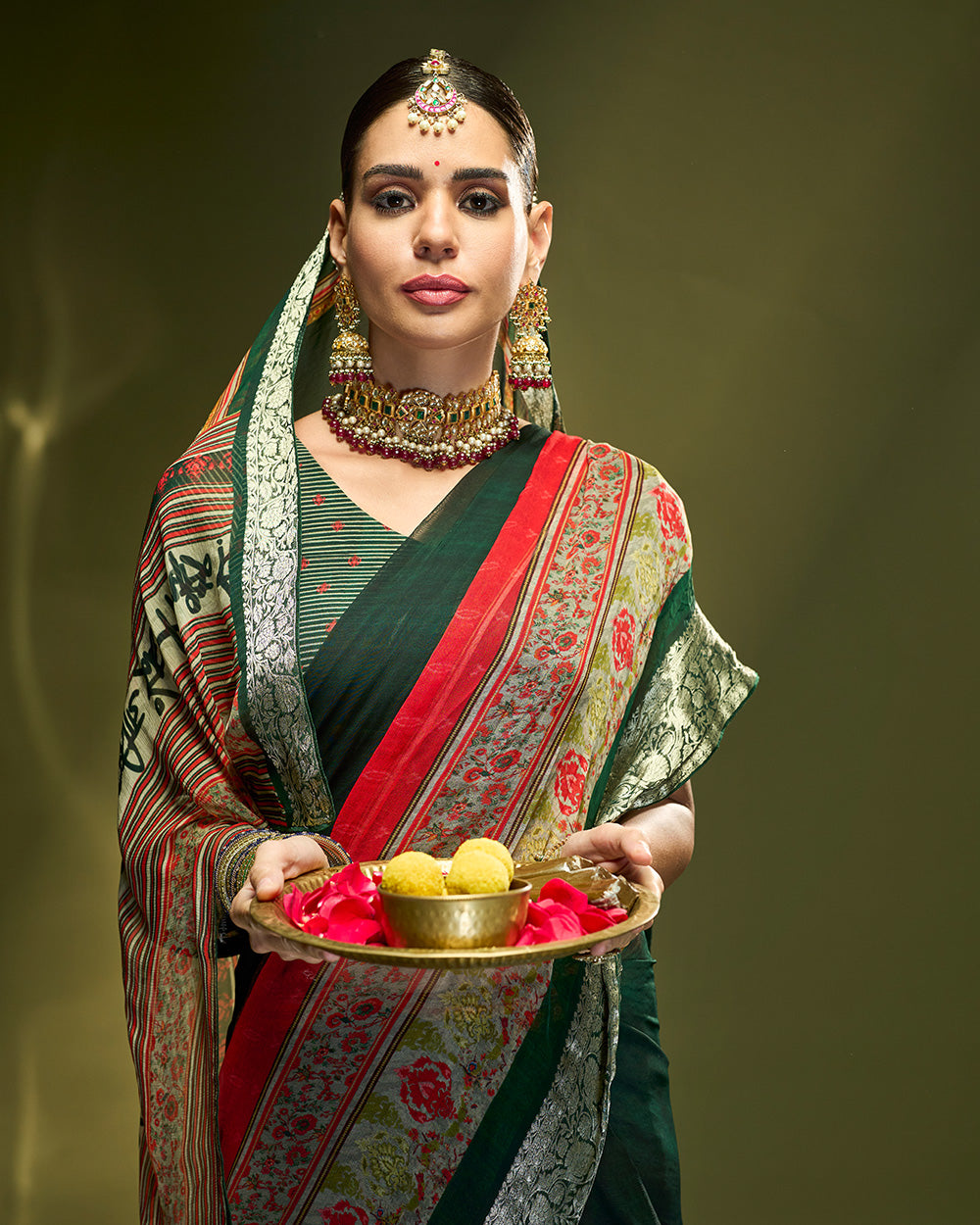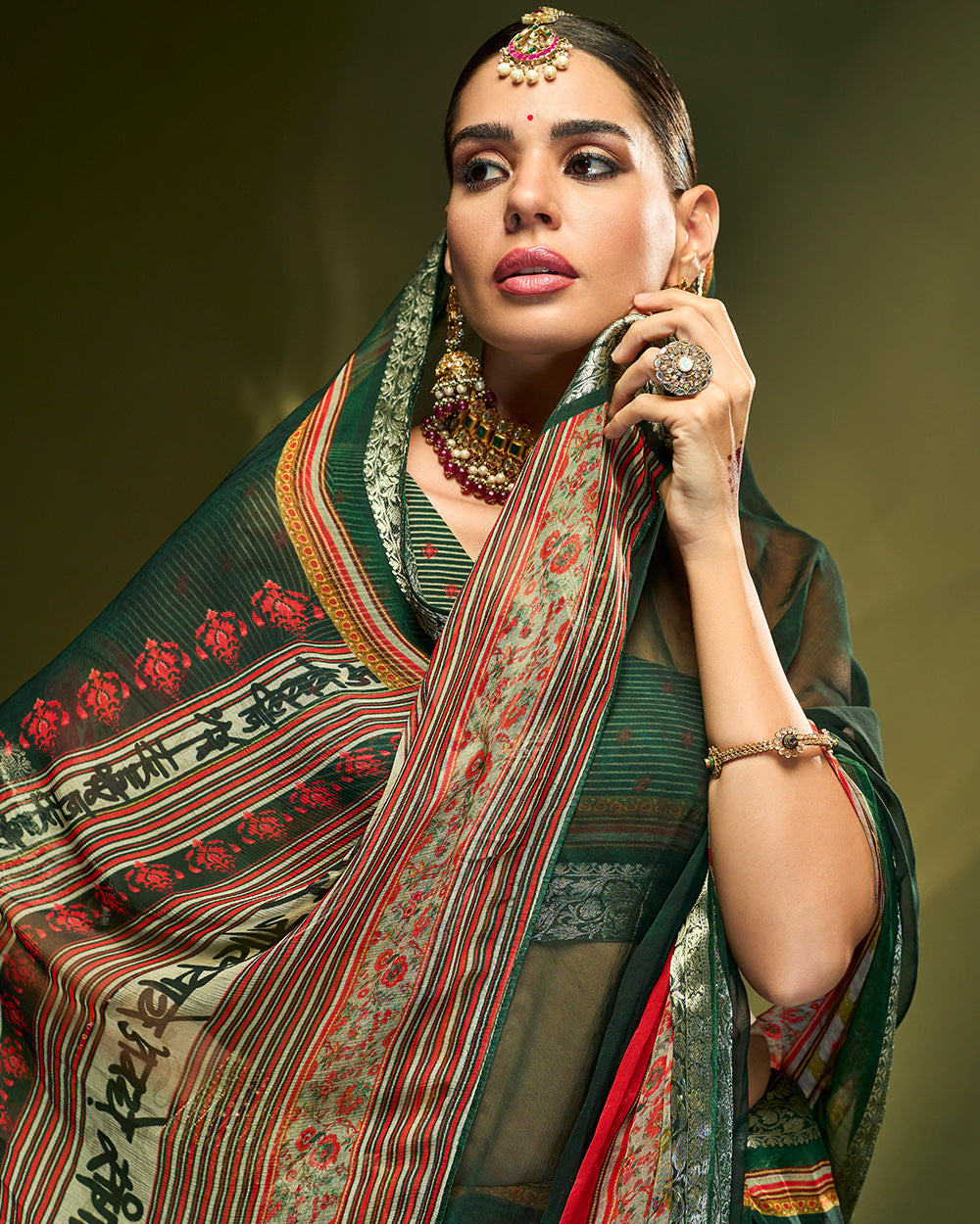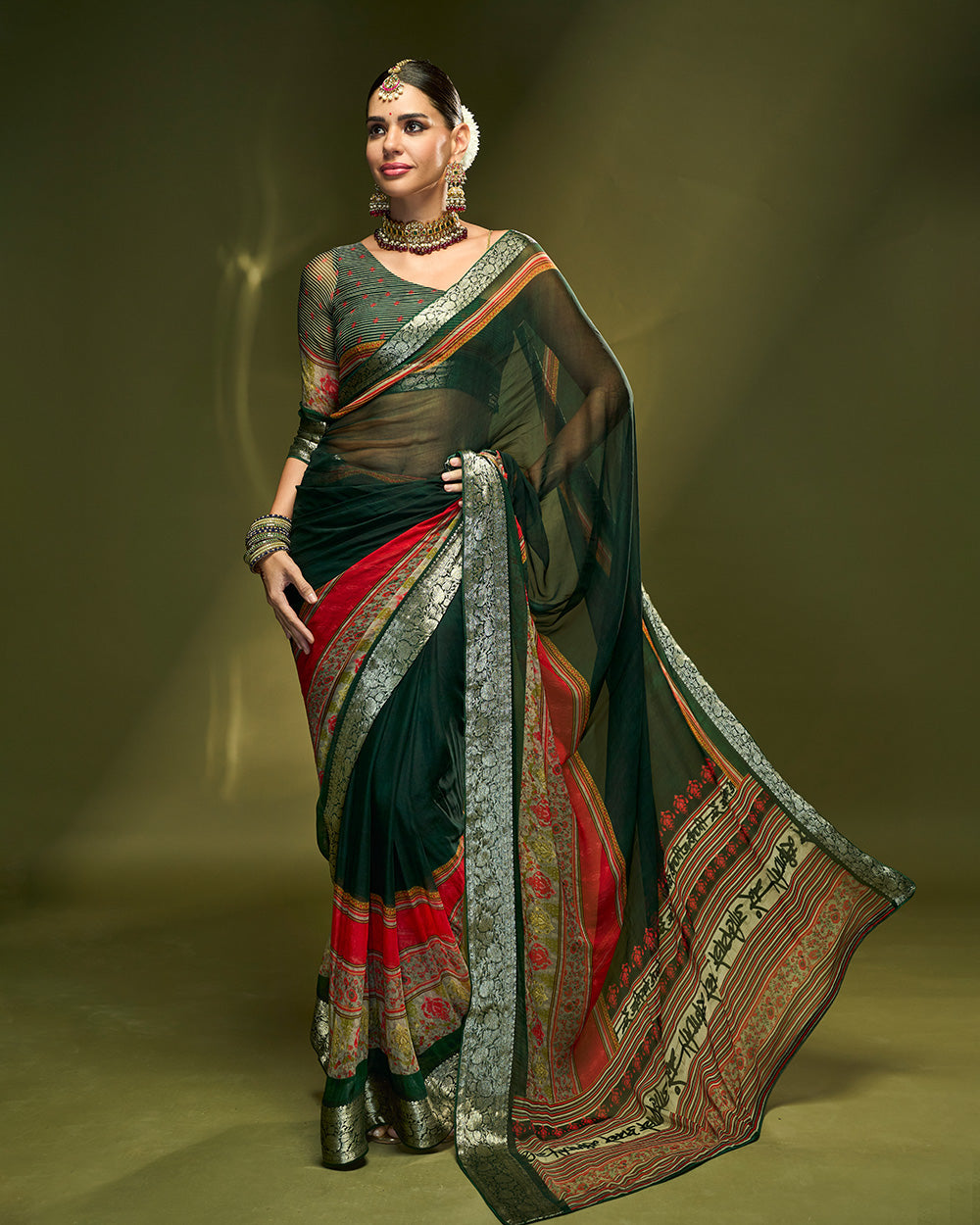 Intricated in pure chiffon silk, this saree in deep green is enhanced with rich red accents and traditional floral pattern in muted gold. The contrast of colors and pure silver zari border lends a regal touch, while the detailed pallu completes it as an elegant pick for festive occasions.