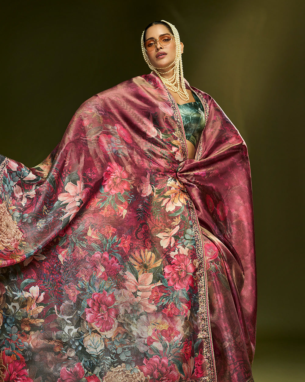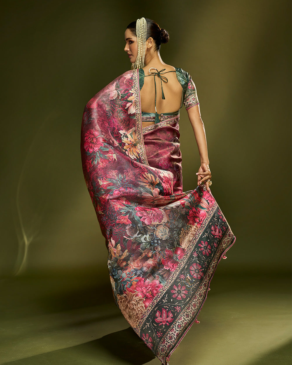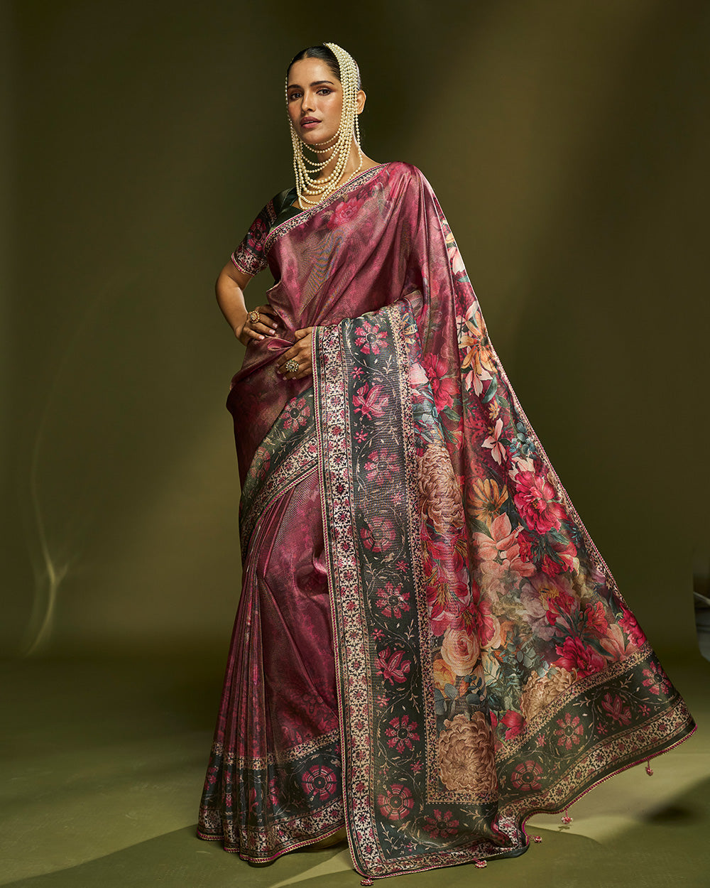 Crafted in lightweight natural tussar, this wine toned saree blooms with lavish floral artistry in radiant hues. The fabric drapes effortlessly and tassels and thread lace bringing richness to every movement. A refined choice for evening celebrations.
