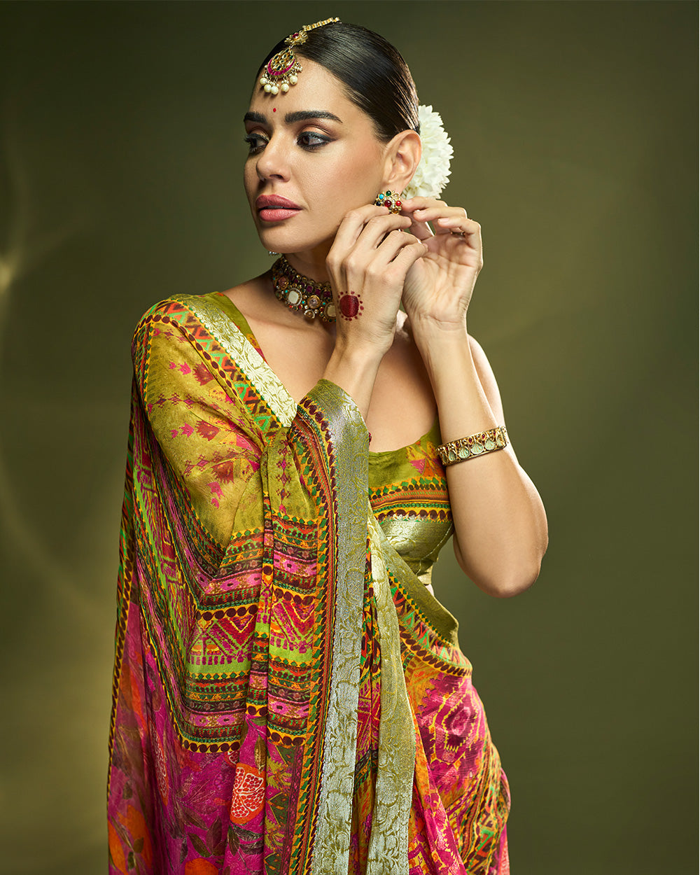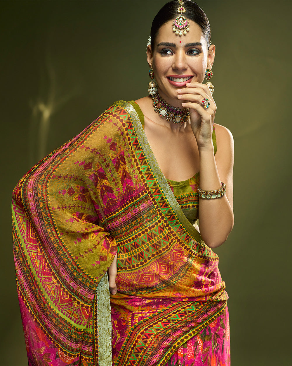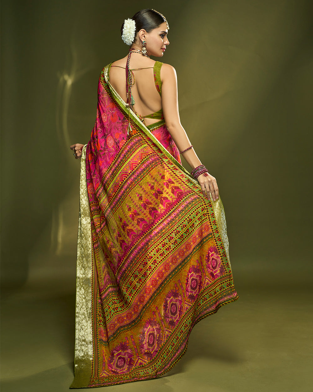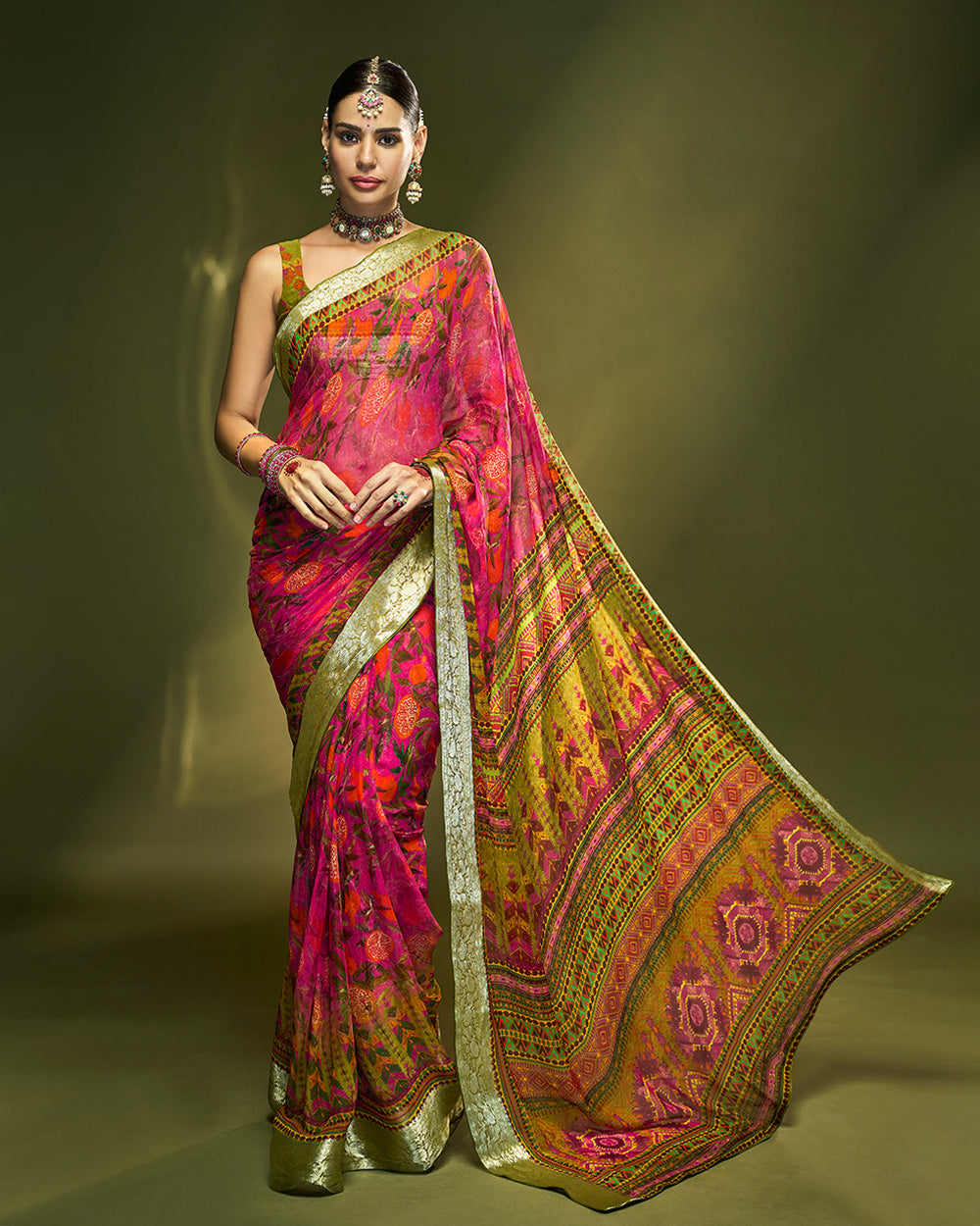 Designed in pure chiffon silk this vibrant pink saree with parot green pallu adorned with ethnic print, beautifully accented by fusion of orange and pomegranate hues , creating a radiant celebratory vibe, while the pure silver zari border makes it a perfect choice for special occasions.