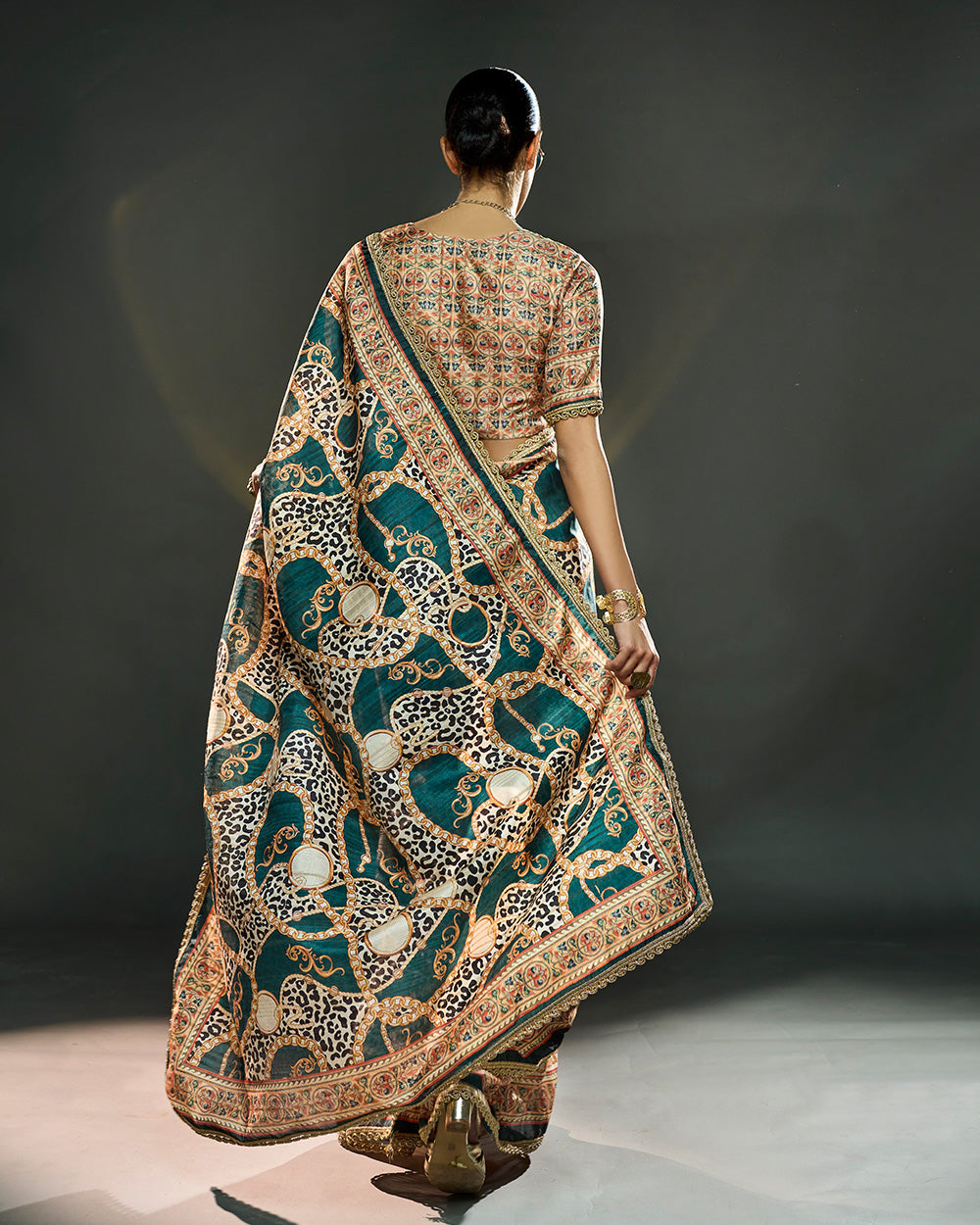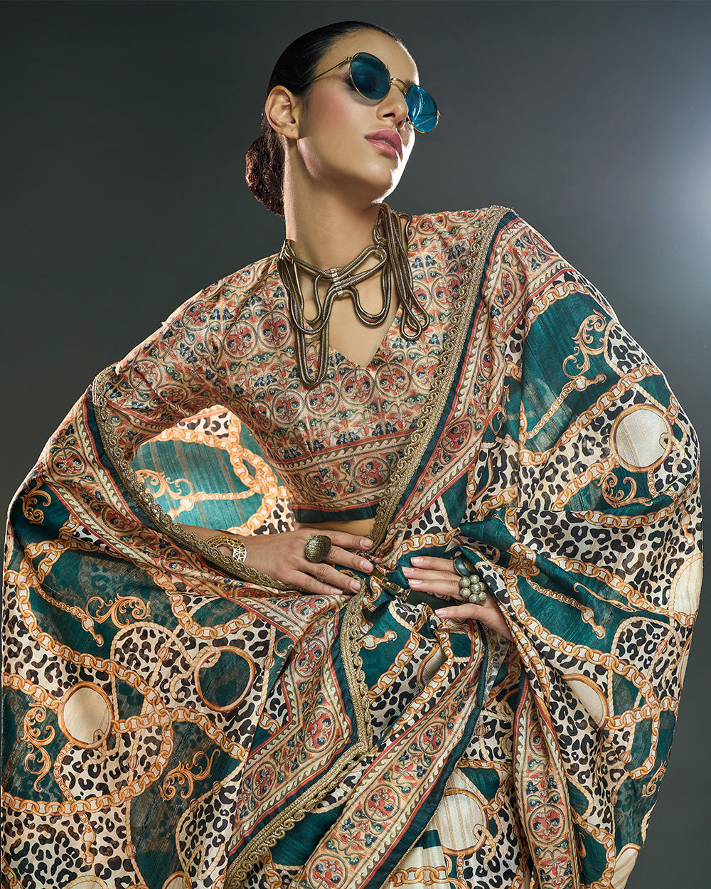 A contemporary tereylene slub silk half and half saree featuring green stripes and a dramatic pallu with baroque animal print finished with trim gold lace Its fluid drape carries an air of majesty. A statement piece for royal occasions.