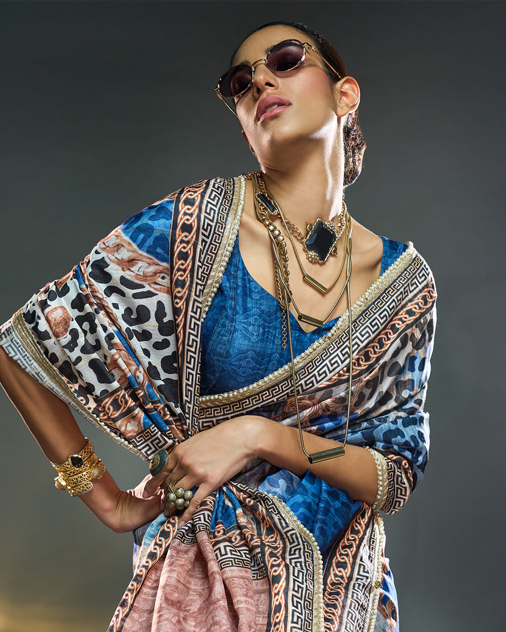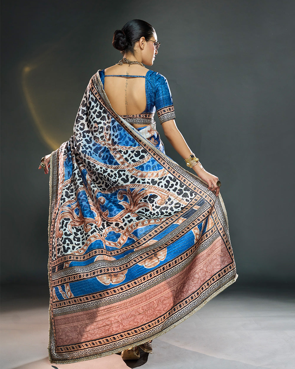 A terelyen slub silk featuring the royal blue elegance with Victorian motif complemented by a statement pallu of animal and digital prints, adorned with pearl lace for a refined festive look Its rich drape exudes regal sophistication. An exquisite choice for grand occasions.
