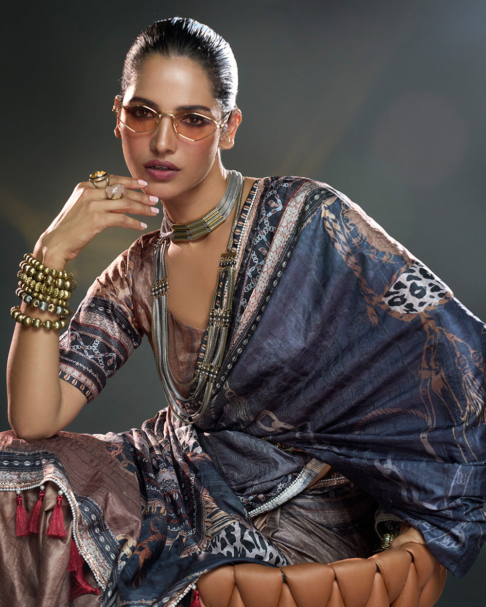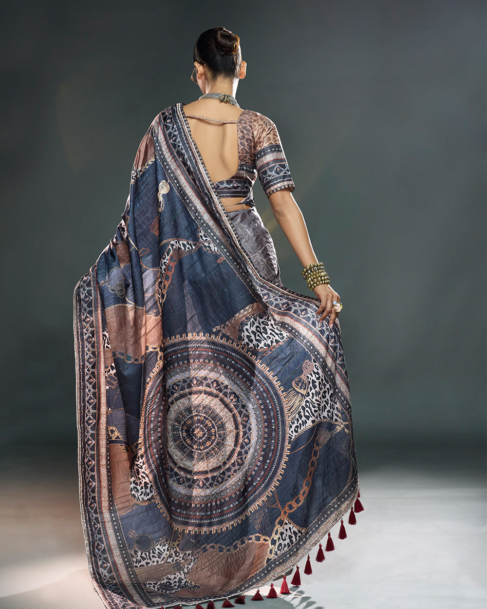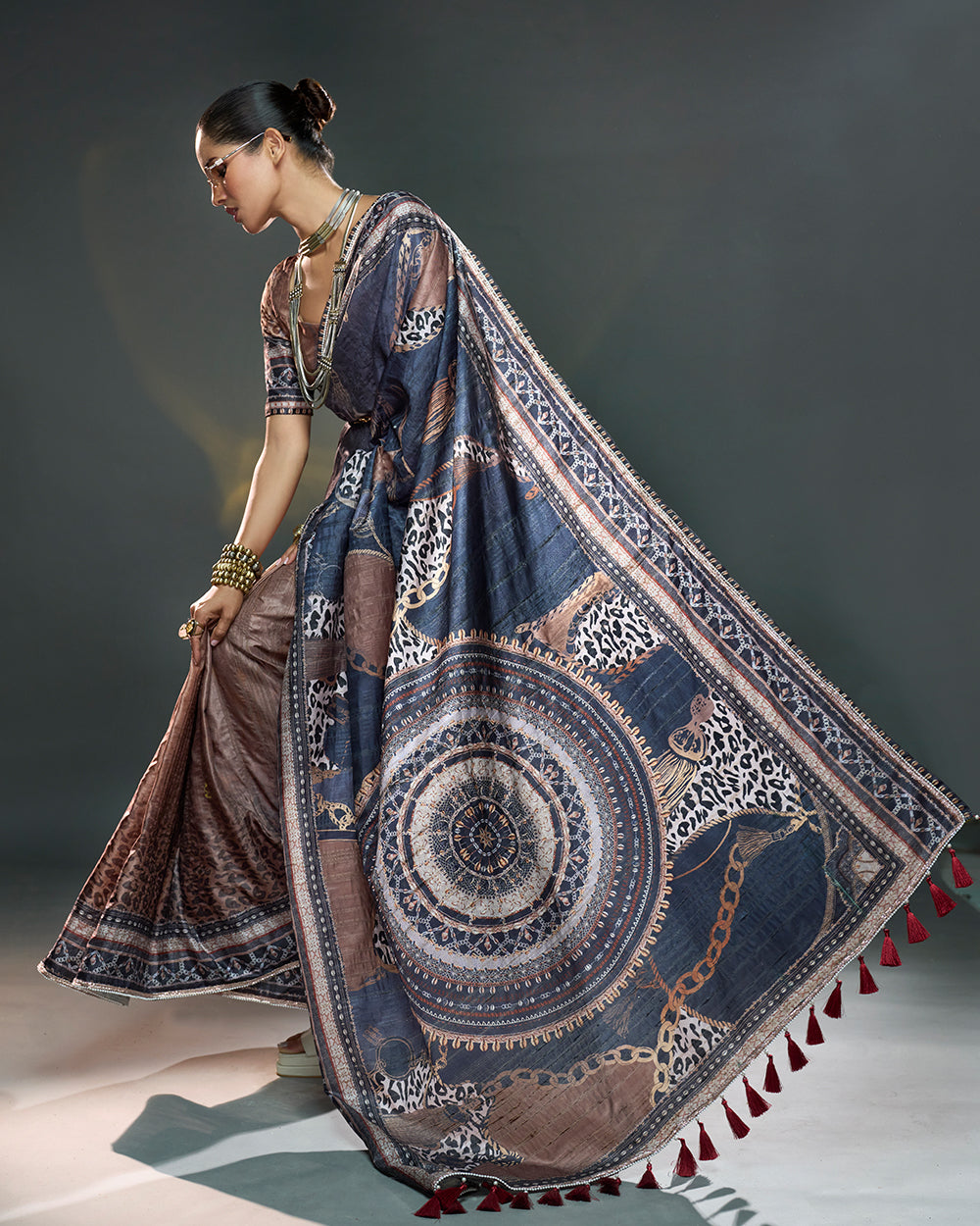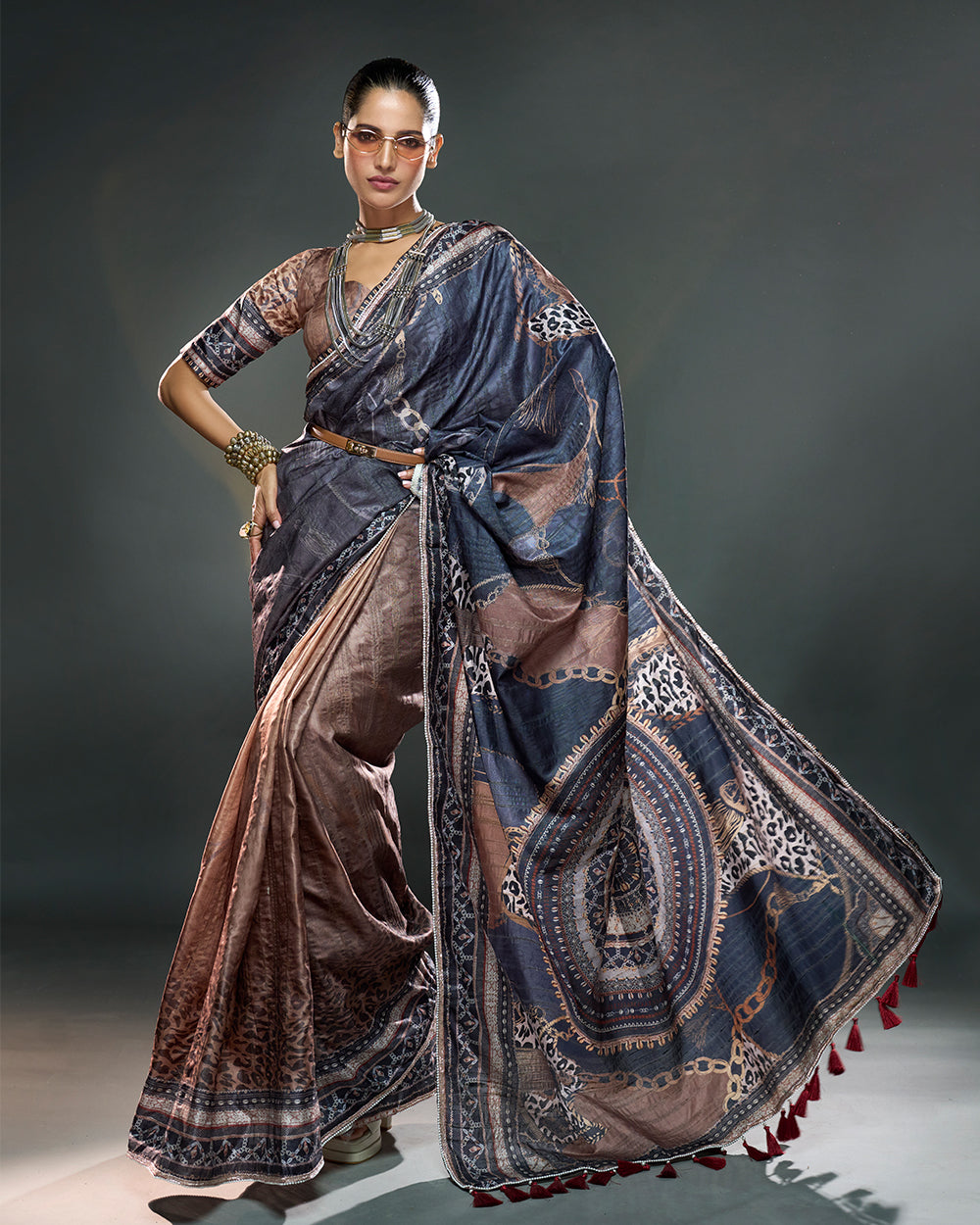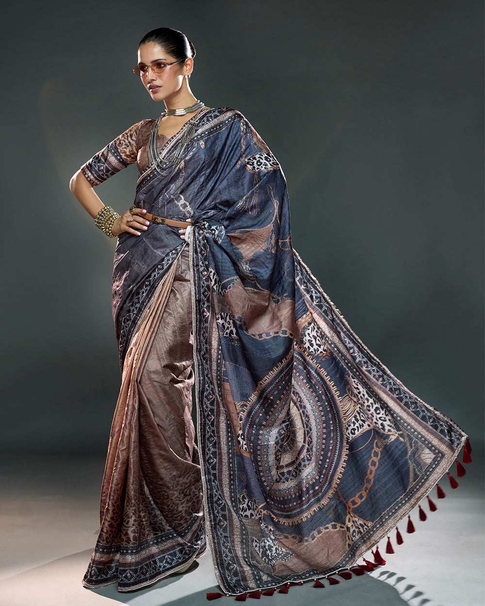 Presenting terelyne slub silk with a warm ombre of deep bronze body with graphite grey pallu , adorned with golden sphere chains, animal print, and embellished with pearl seed bead lace creates a classic elegant drape. The luxurious composition of maroon tassels reflects regal grandeur and making it an opulent choice for royal occasions.