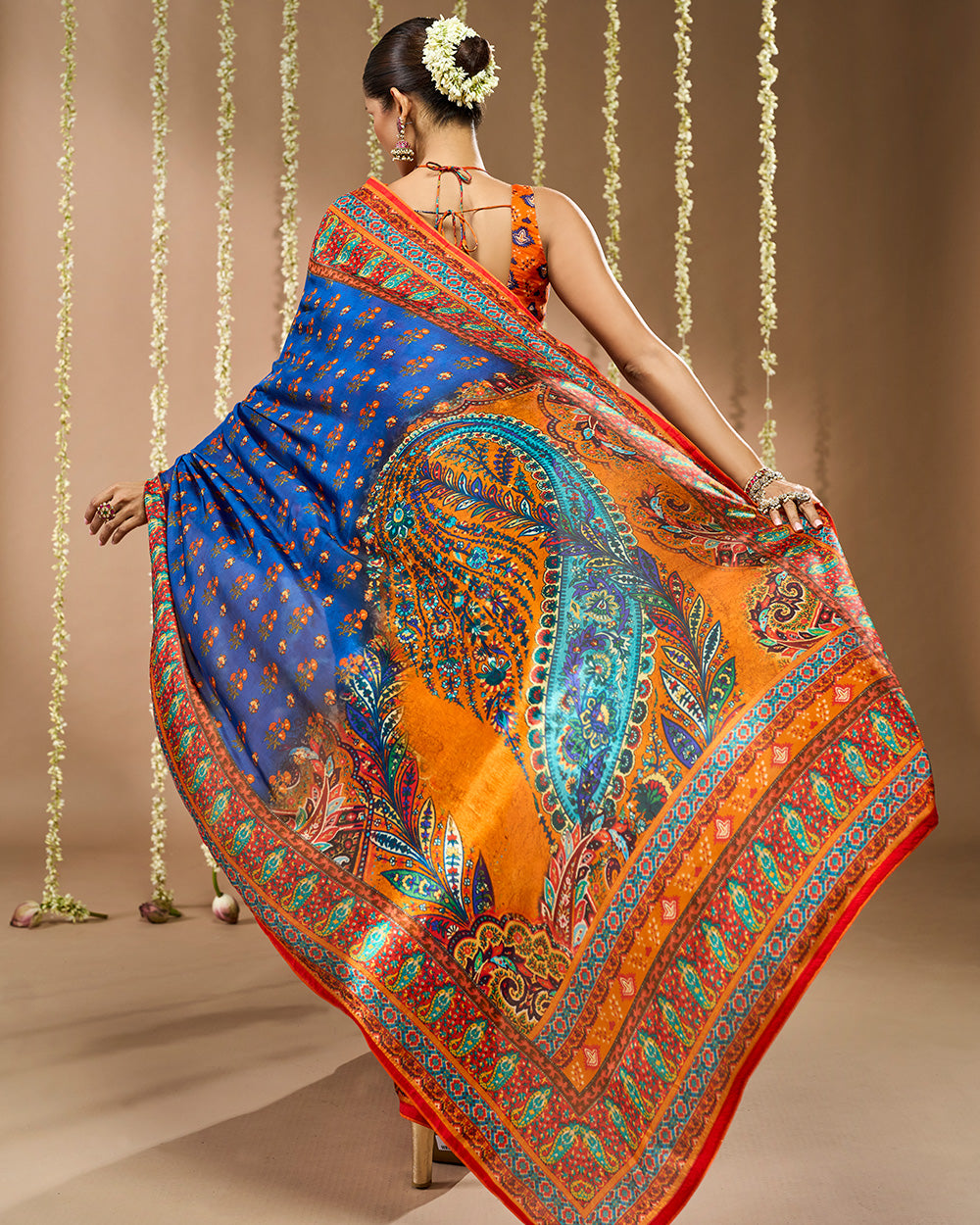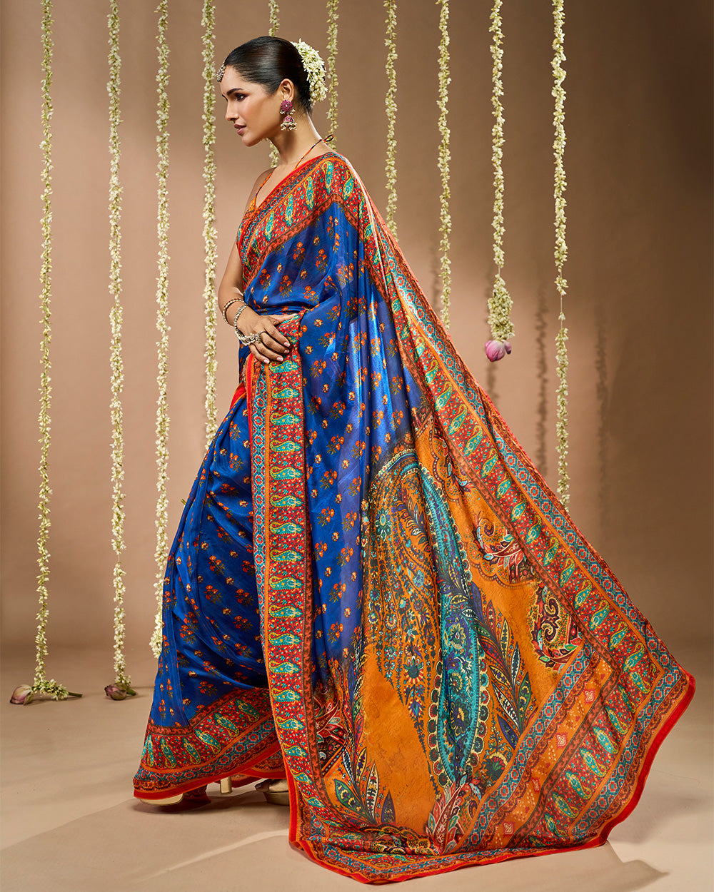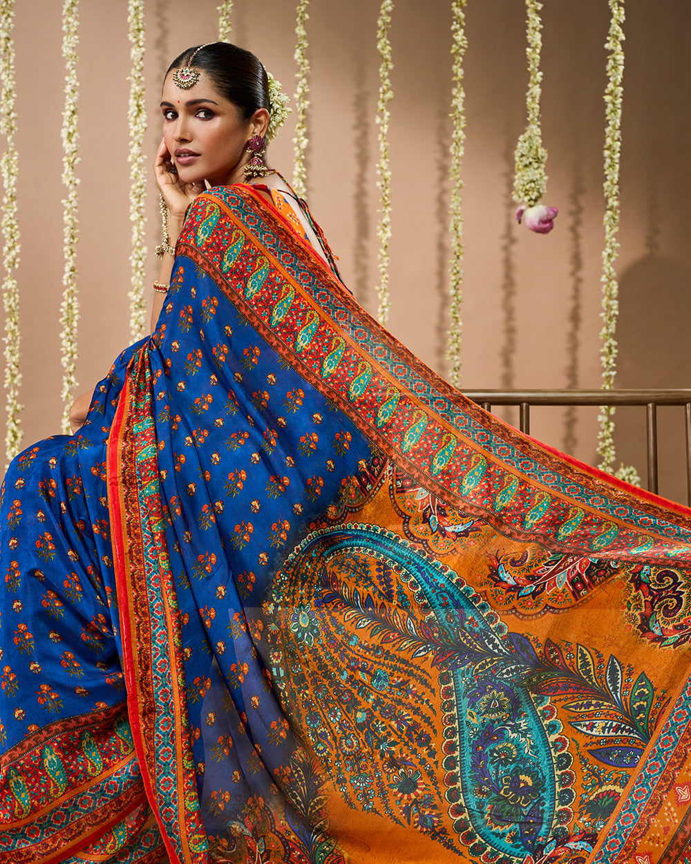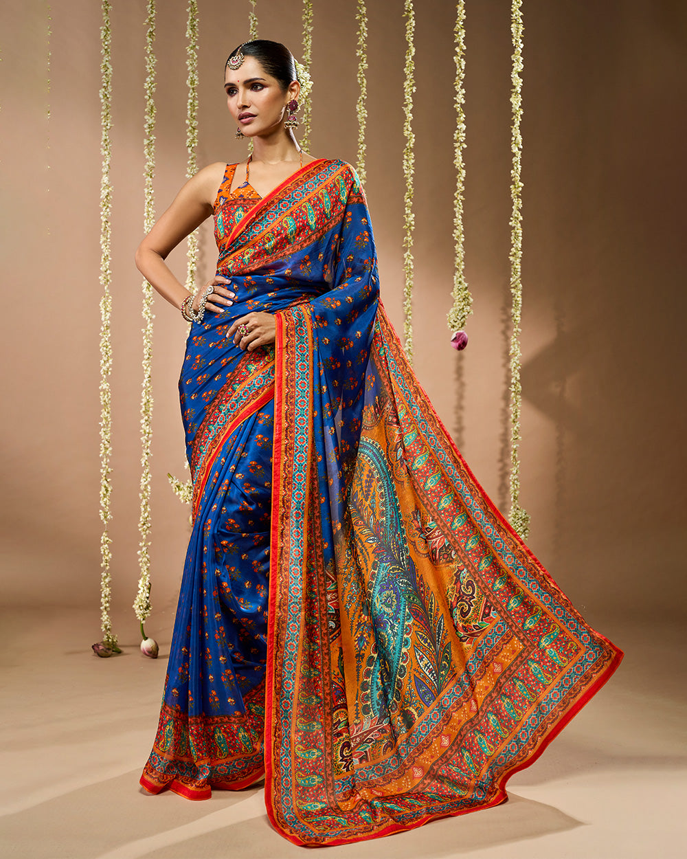 Crafted in Pure Crepe Viscose Silk, this saree in navy blue and saffron orange is adorned with traditional butti motifs and framed with sacred borders. The pallu features grand paisley artistry in vibrant hues making it a timeless drape for auspicious and festive occasions.